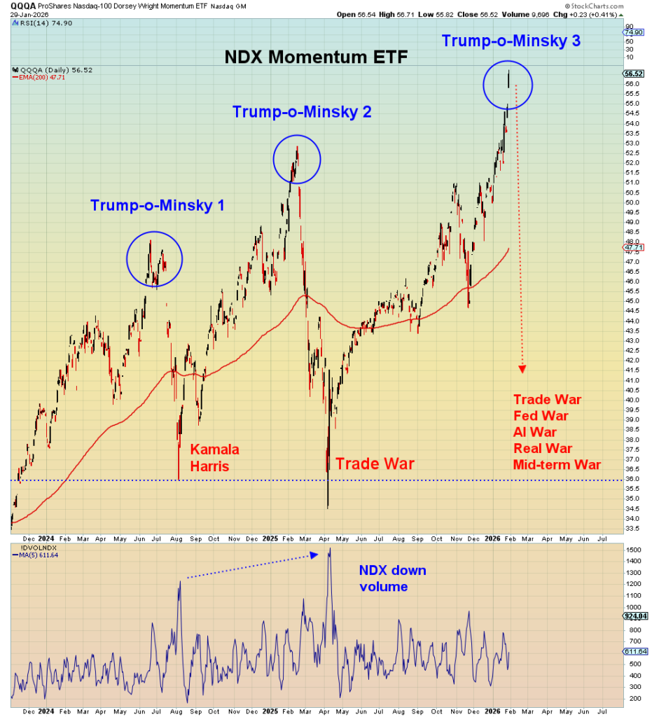 再登一次昨晚登过的 Trump Minsky 图。 什么是明斯基时刻(Minsky Moment)? 它是指在信贷周期或景气循环中,由于长期资产价格上涨和杠杆率攀升,导致债务累积超过临界点,引发投资者信心崩溃并不得不大量抛售资产,从而导致资产价格一夕崩盘和流动性枯竭的转折点。该概念由PIMCO的保罗·麦克里在1998年为描述俄罗斯金融危机时提出,命名自经济学家海曼·明斯基。