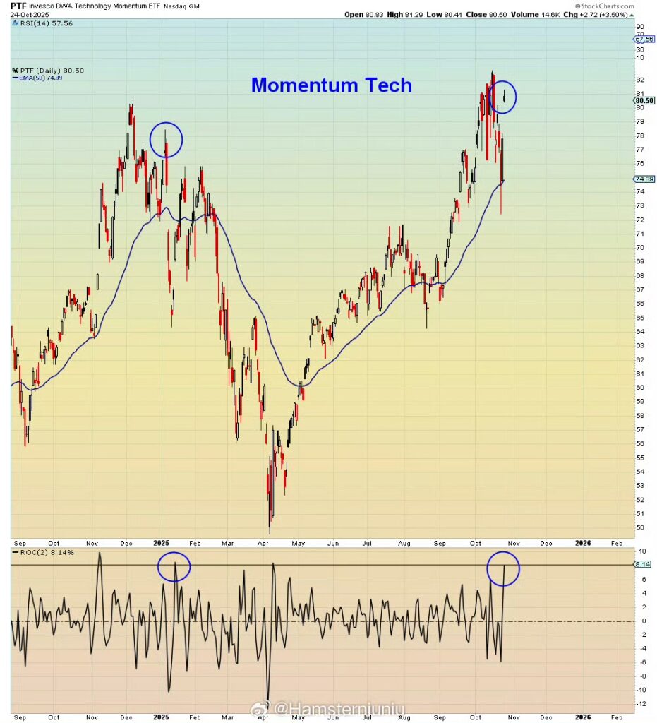 After market Leave a Comment / Newsletters / By NiuNiu 今天影响美股的重磅,自然是美国政府关门之际公布的美国9月 CPI消费者价格指数 – 低于预期。9月份核心物价指数上涨0.23%,导致12个月核心CPI环比增长至3.0%。总体物价指数上涨0.31%,CPI环比增长3.0%。9月份CPI对美联储月底会议的意义:它可能会削弱美联储鹰派人士对降息(10月或12月)的抵制情绪。白宫表示,由于政府关门,10月份CPI数据可能不会公布。如果这一消息属实,那么今天公布的9月份CPI将是美联储在12月联邦公开市场委员会(FOMC)会议第二天上午之前最后一次看到的CPI数据。周末之前,我要分享以下这个“有趣”的价图,有兴趣技术分析的会员同学,可以看看。昨天和今天是自1月份以来50天中最大的两天反弹。1 月份那次的第二大两天反弹,随后直线下跌。周末愉快!