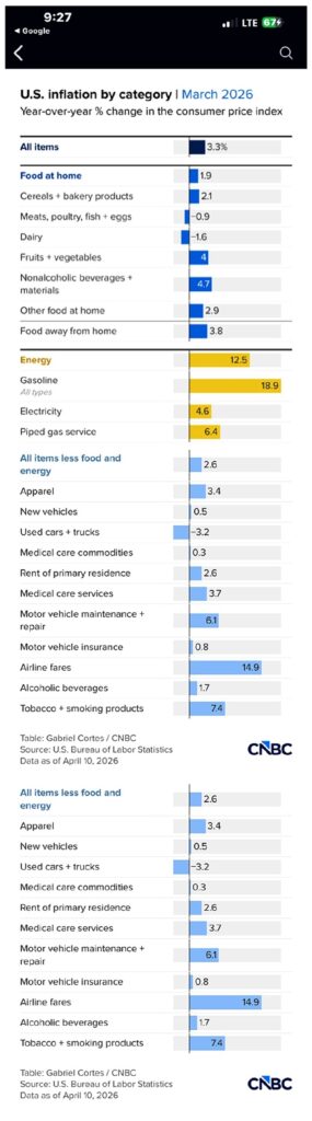 昨天早上8点30分(美国东部时间),美国劳工统计局发布了2026年3月消费者价格指数(CPI)报告。数据并不乐观,甚至可以说糟糕。3月份总体CPI同比上涨3.3%,高于2月份的2.4%。这是自2022年疫情后经济激增以来,总体通胀率单月涨幅最大的一次。剔除食品和能源价格的核心CPI同比上涨2.6%,持续高于央行2%的目标值。