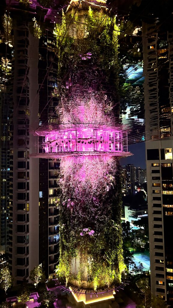 巨型的、长满绿色植物的柱子,在夜晚灯光的效果中,格外梦幻!新加坡太热了,不然,坐在阳台欣赏植物柱子的梦幻,还是很惬意的。