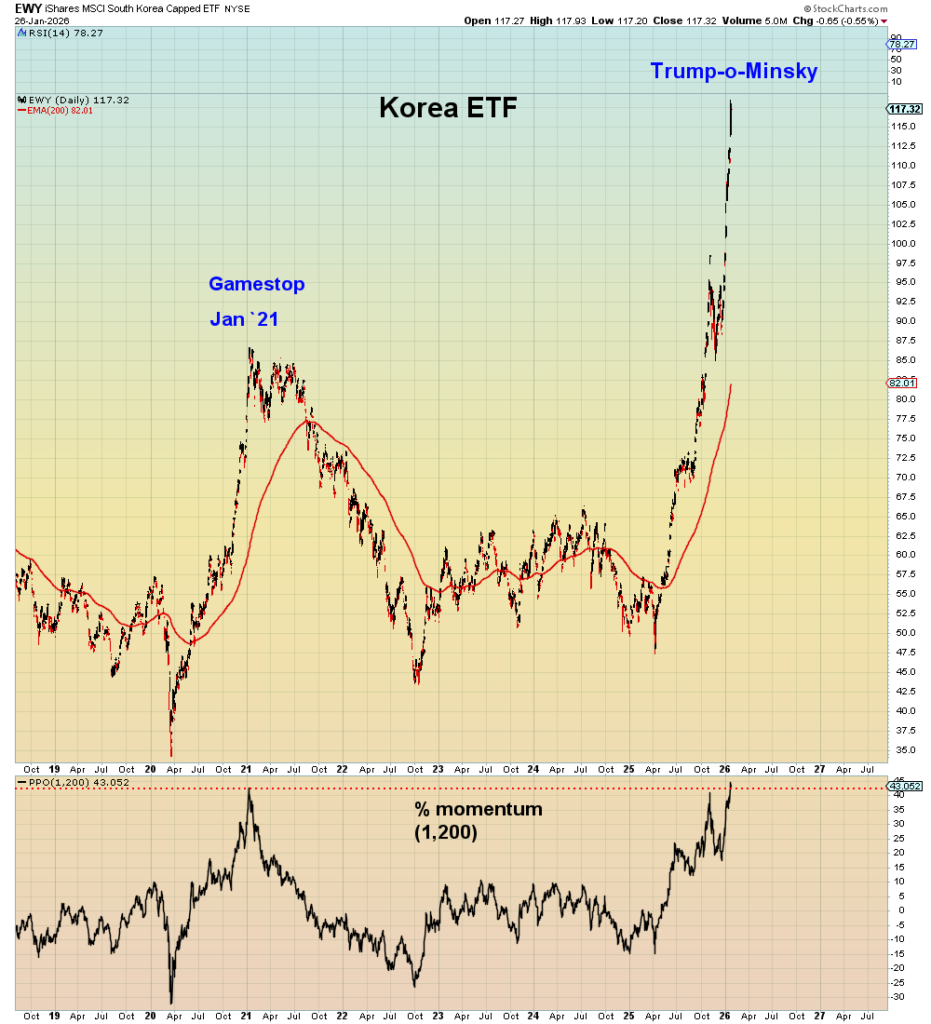 Korean market / Newsletters / By NiuNiu 具体地讲讲今天早上登出的几个黑天鹅推测,先说韩国🇰🇷吧。喜欢技术图的同学,这张韩国Kospi 指数 ETF 分析图,应该引起你的注意。。。韩国政府在2025年中期设定目标,力争尽快实现韩国综合股价指数(KOSPI)突破5000点。为此,他们成立了一个名为“韩国民主党KOSPI 5000点特别委员会”的专门委员会。人工智能存储芯片的热潮推动该指数在上星期突破5000点,较去年同期上涨100%。这是自1999年以来最大的单年涨幅。 三星电子和SK海力士这两家韩国市值最高的公司股价上涨,提振了该指数。由于韩国未能实施去年夏天与🇺🇸达成的贸易协议,川普正在升级与韩国的贸易战,又要加大关税。受提高关税消息的影响,韩国股市隔夜暴涨。看涨的bulls 押注“TACO”策略再次奏效。哈哈,KOSPI 在高位啊,TACO策略在高位时不如在低位时有效👌韩国股市崩盘是黑天鹅预测之一。现在我们将拭目以待,看看这个全球估值过高、过度买入的股市将如何应对这一消息。再次注意2021年1月的参考日期。可以预见,川普接下来将逐个国家地发起第二轮贸易战。