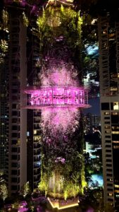 巨型的、长满绿色植物的柱子,在夜晚灯光的效果中,格外梦幻!新加坡太热了,不然,坐在阳台欣赏植物柱子的梦幻,还是很惬意的。
