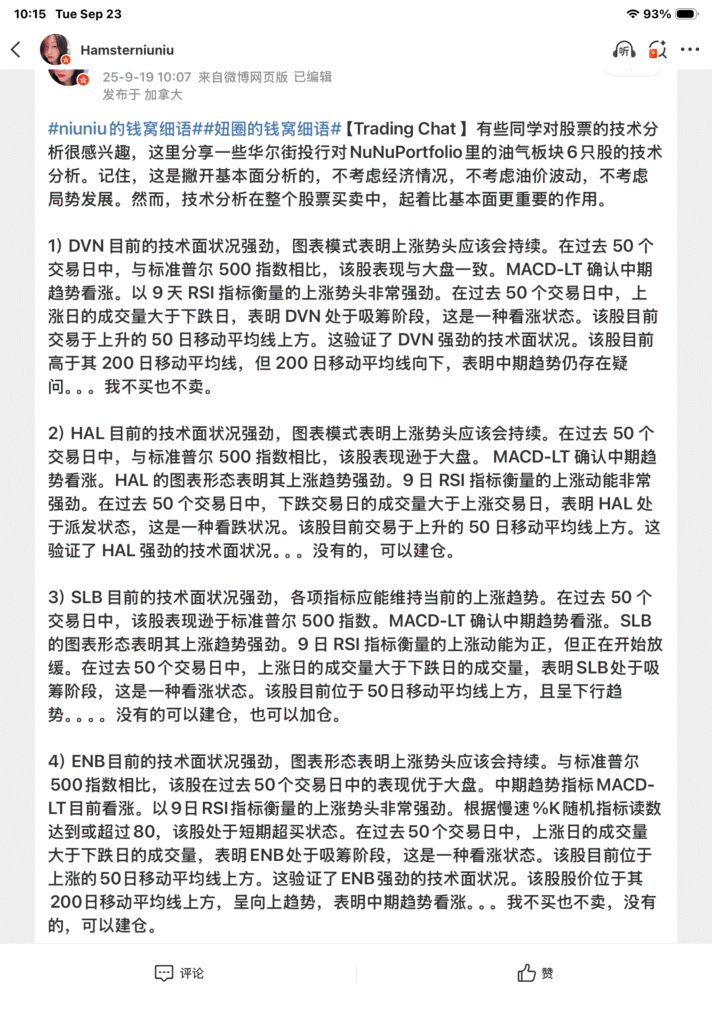 Trading Chat – oil and gas Leave a Comment / Newsletters / By NiuNiu 都有看上星期末我登的油气板块的技术分析吧,我截图放在这里。相信会员班的同学,几乎每个人都有这个组合的股票。。。那么油气的最新动向又是什么呢:今天周二,WTI 原油期货扭转早盘跌势,收于每桶 62.80 美元附近,结束了连续四天的下跌,交易员仍关注供应前景和潜在风险。据报道,伊拉克可能很快恢复通过库尔德斯坦的出口,这可能使约 23 万桶/日的原油重新流向国际市场。由于付款纠纷,库尔德斯坦的出口已中断两年多。伊拉克还根据 OPEC+ 协议增加了石油出口,预计 9 月份的出口量将在 340 万桶/日至 345 万桶/日之间。与此同时,北约盟国周一在联合国指责俄罗斯侵犯了爱沙尼亚和波兰的北约领空,英国警告称,此举可能引发武装冲突。在以色列继续在加沙地带发动战争,并在被占领的约旦河西岸扩建定居点的背景下,数十位世界领导人齐聚联合国,正式承认巴勒斯坦国,中东紧张局势持续升温。.
